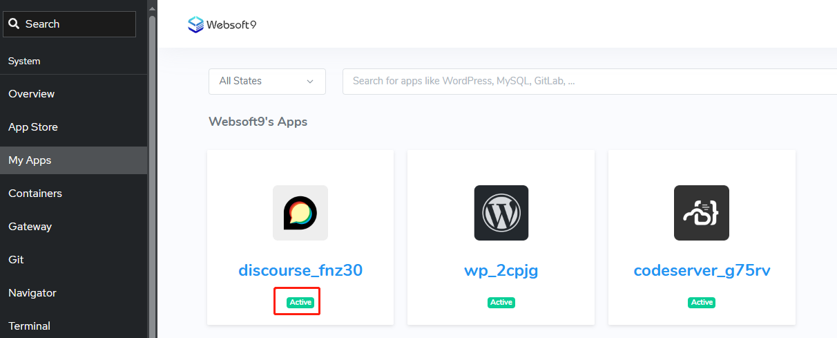 1. Go to the catalog App Runtime > Docker from Websoft9 App Store