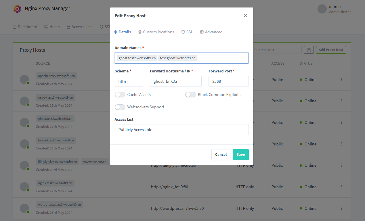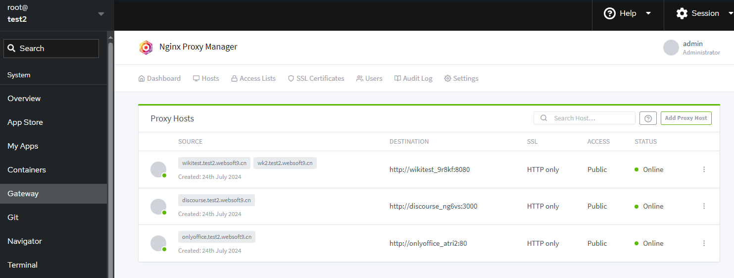 Login to Websoft9 Console, open the Hosts > Proxy Hosts of Gateway
