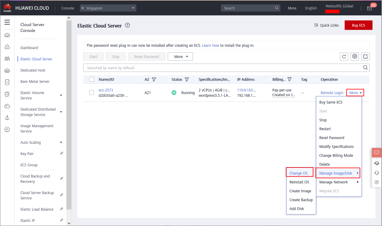 • Manage Image/Disk >Change OS for already existing ECS